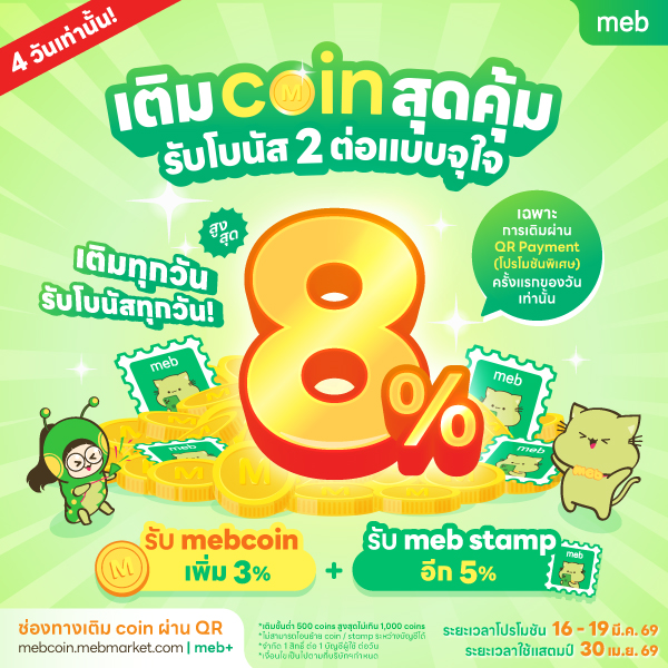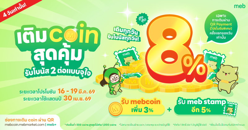 รายการส่งเสริมการขายนี้ นับเฉพาะยอดเติม mebcoin ผ่าน QR Payment (โปรโมชันพิเศษ) วันที่ 16 - 19 มี.ค. 69 ตามเวลาประเทศไทย ที่เว็บไซต์ www.mebmarket.com, แอปพลิเคชั่น meb และ meb+