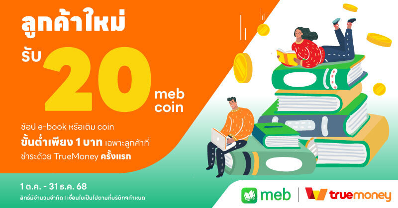 รับ 20 mebcoin เมื่อช้อป e-book หรือเติม coin ที่ meb หรือ readAwrite โดยมียอดซื้อเพียง 1 บาทขึ้นไป เฉพาะลูกค้าที่ชำระด้วย TrueMoney ครั้งแรก