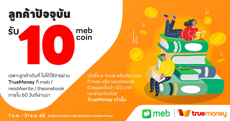 รับ 10 mebcoin เฉพาะลูกค้าปัจจุบันที่ ไม่ได้ใช้จ่ายผ่าน TrueMoney ที่ meb / readAwrite / theonebook ภายใน 60 วันที่ผ่านมา
