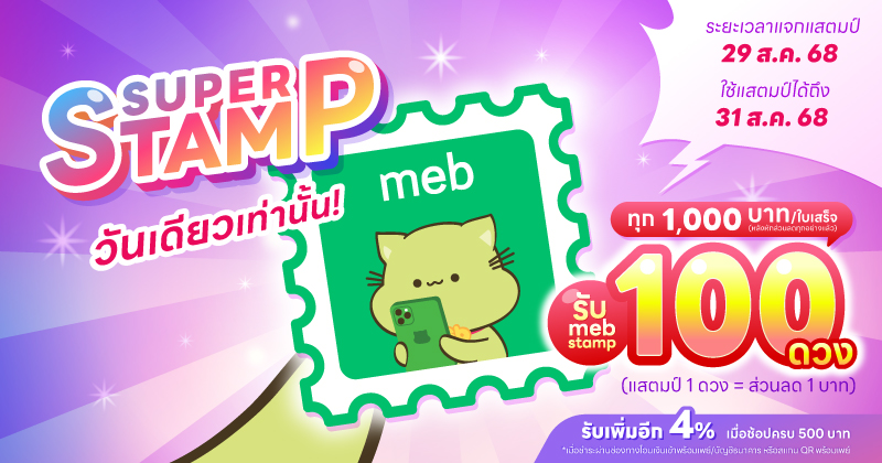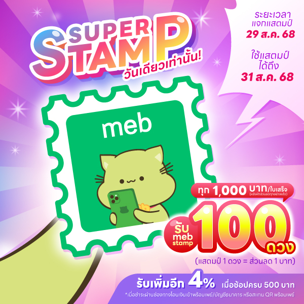 การใช้ meb stamp เป็นส่วนลด สามารถใช้ได้สูงสุดไม่เกิน 50% ของยอดชำระรวมในการซื้อต่อใบเสร็จ