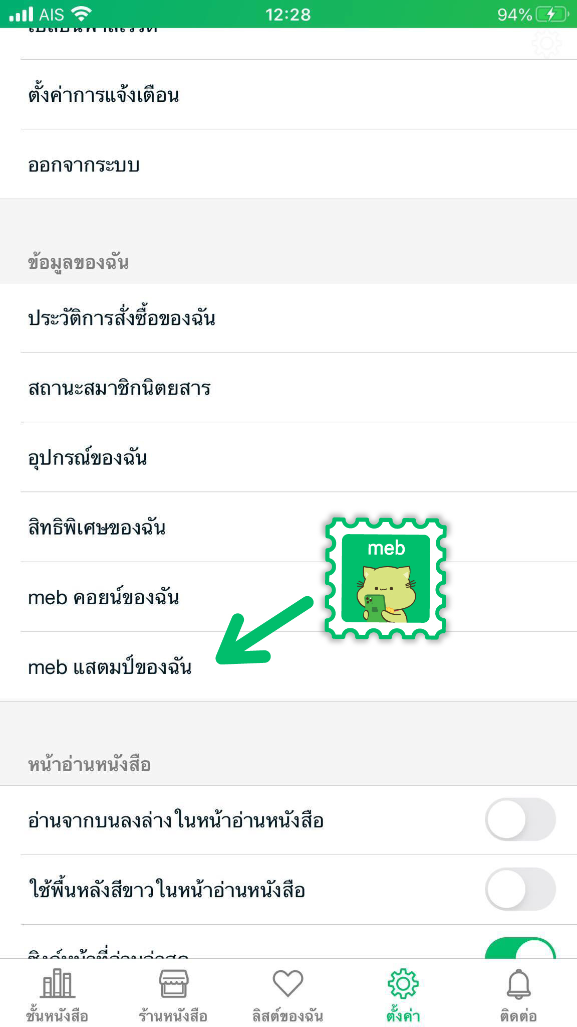 www.mebmarket.com บนแอพพลิเคชั่น meb เข้าไปที่ “ตั้งค่า” แล้วกดเลื่อนมาที่คำว่า “meb แสตมป์ของฉัน”